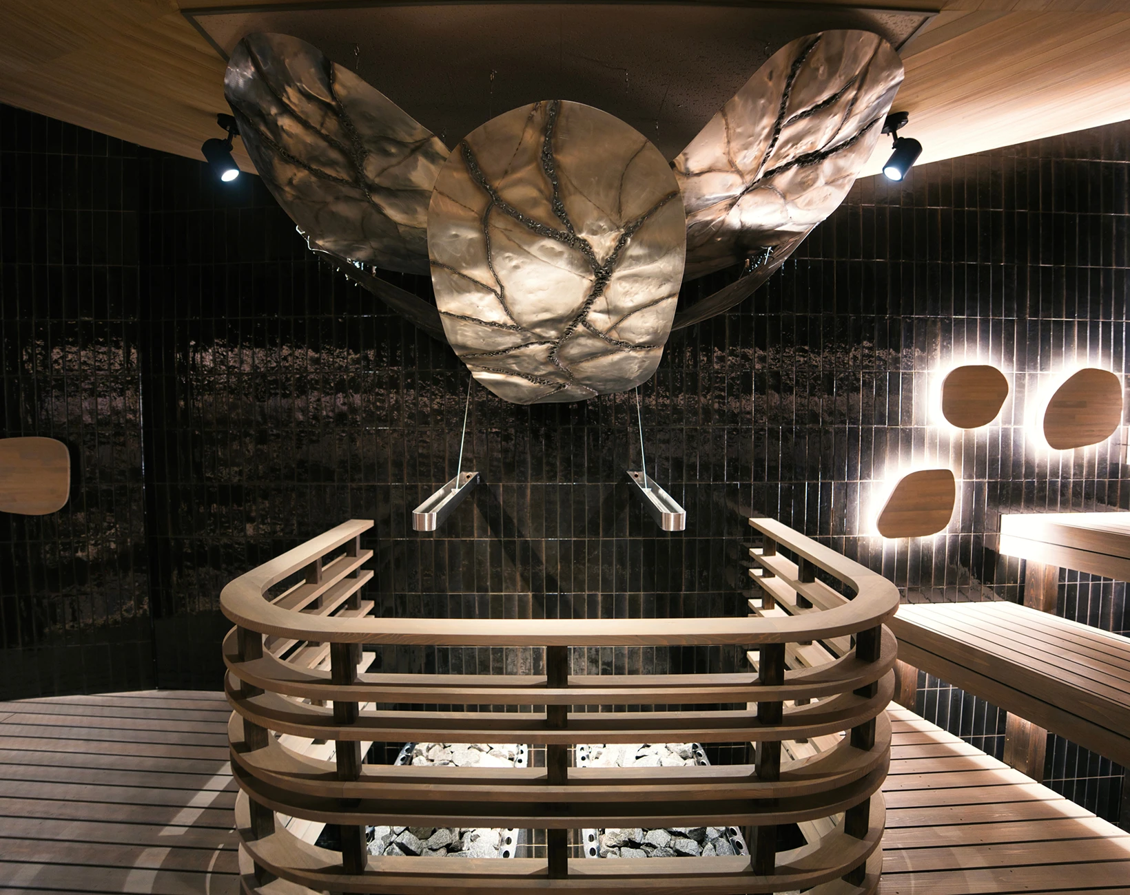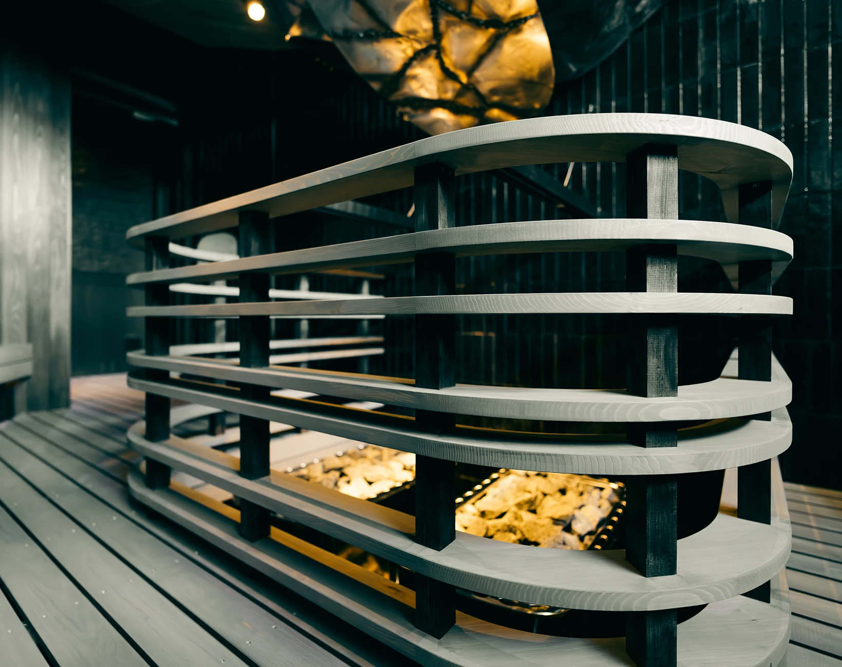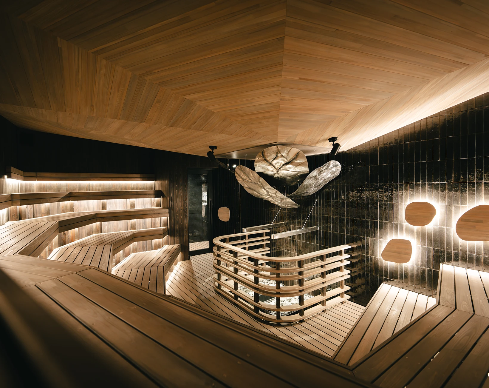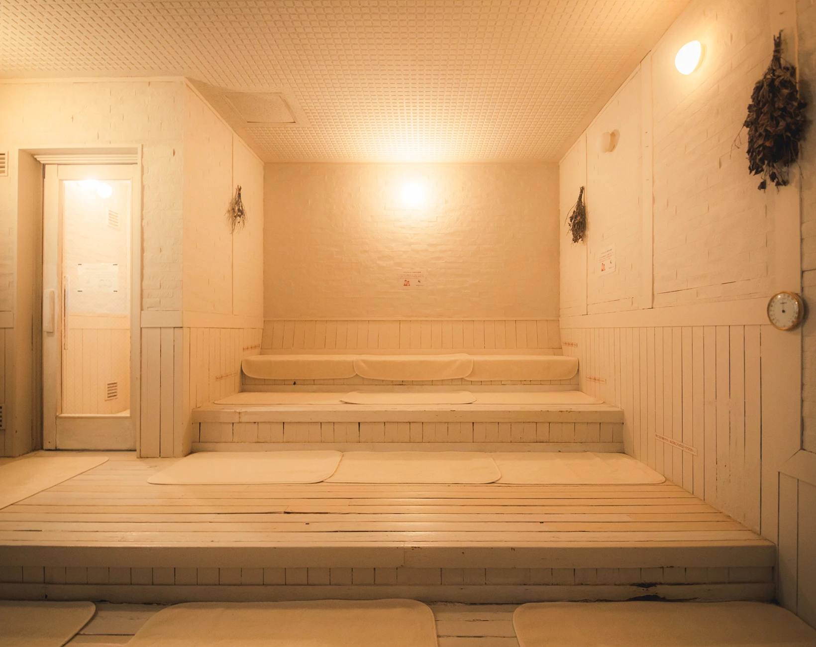 2025年全面リニューアルした男性用大浴場のサウナ室。サウナ音楽家とくさしけんご氏・WHITELIGHTの共同開発による新たな音響体験、アロマ水を用いた独自のオートロウリュウ装置など五感を刺激する体験を提供します。