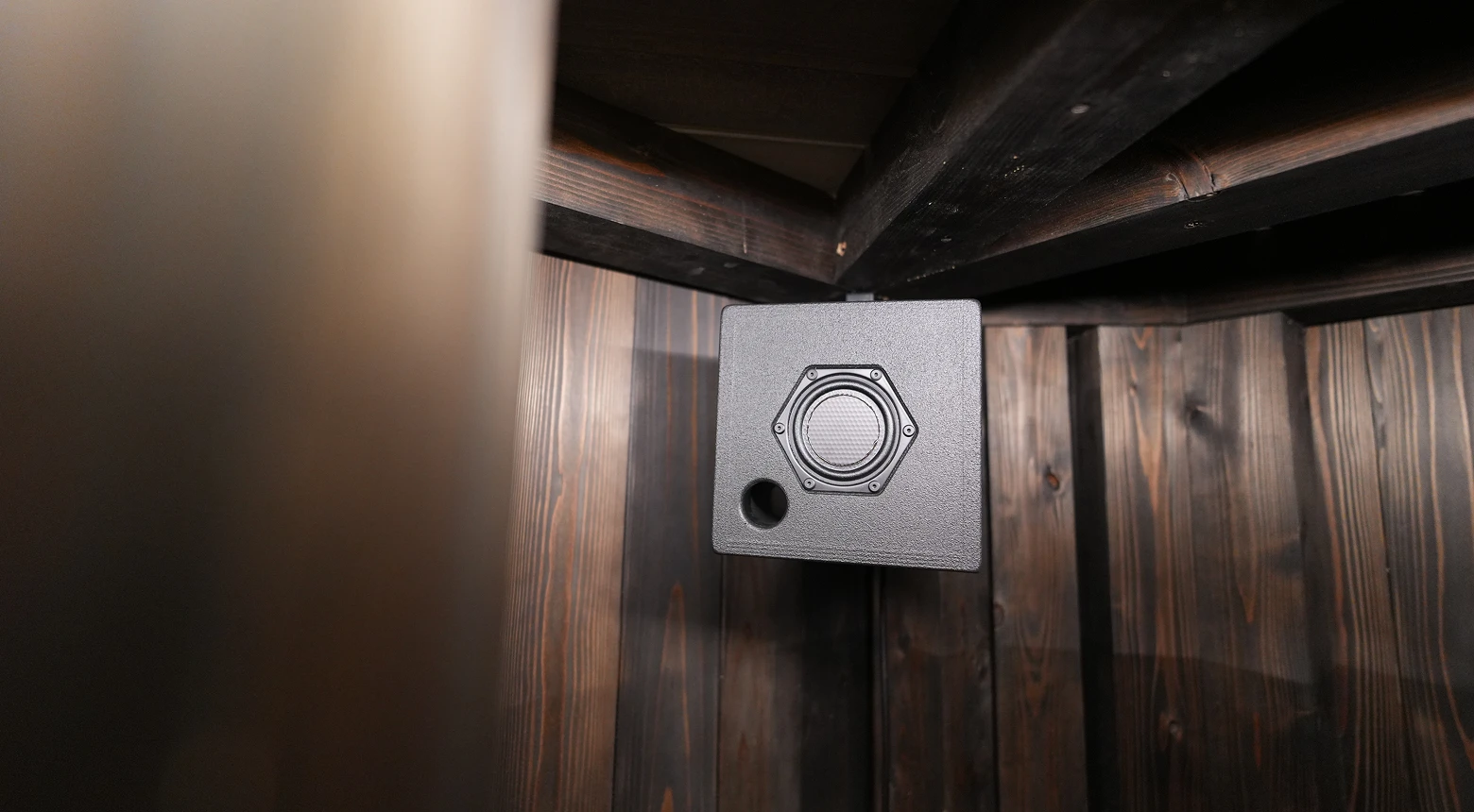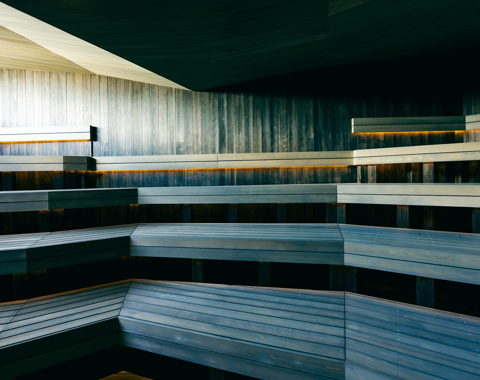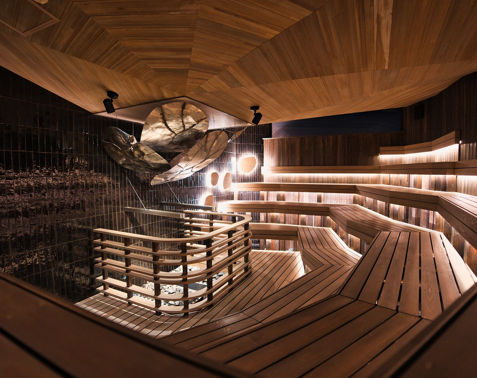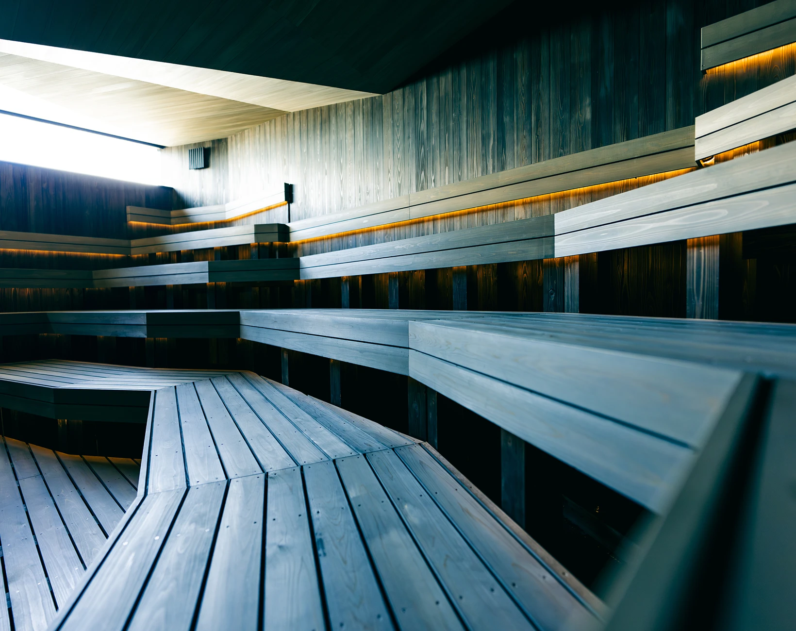 2025年全面リニューアルした男性用大浴場のサウナ室。サウナ音楽家とくさしけんご氏・WHITELIGHTの共同開発による新たな音響体験、アロマ水を用いた独自のオートロウリュウ装置など五感を刺激する体験を提供します。