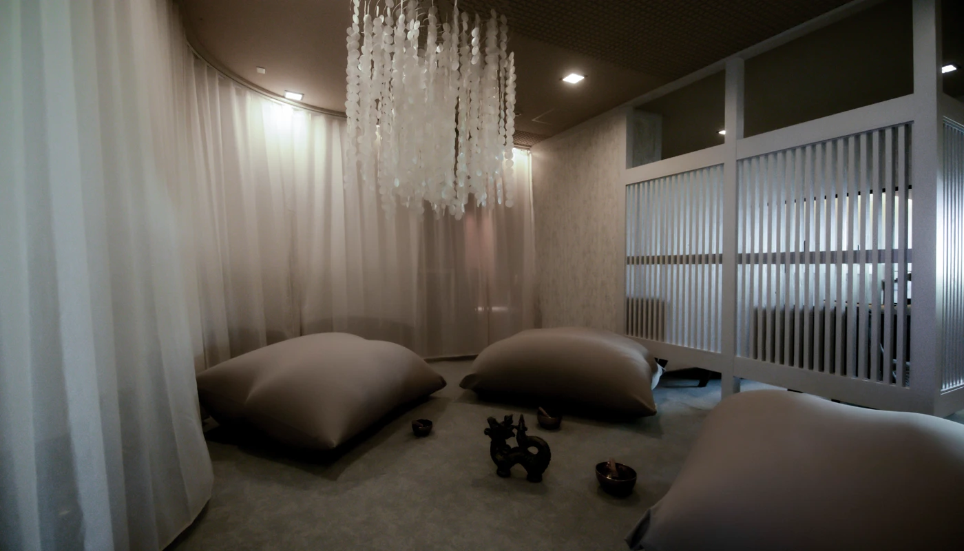 チェックアウト前のひとときは、ソファやヨギボーで静かに読書を。女性専用ルーム「KU」なら、朝までの余韻を静かに楽しめます。